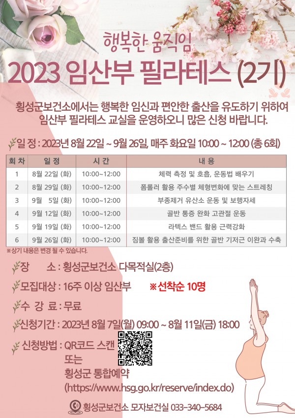 - 행복한 움직임 임산부 필라테스 2기 : 2023년 8월 7일(월) ~ 8월 11일(금) / 선착순모집